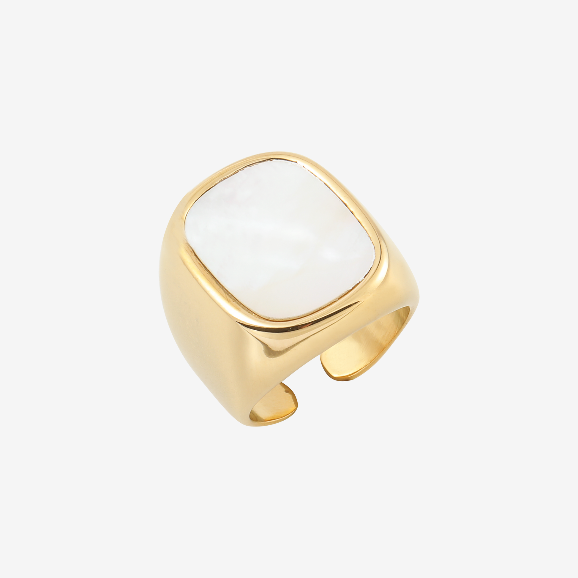 Make a luminous statement with our bold square mother of pearl ring. This striking artisan piece features a large, iridescent natural shell inlay set within a polished, chunky frame. Crafted from premium titanium steel with a thick 18K gold plating, it provides a high-shine finish that is entirely waterproof and tarnish-resistant, ensuring its elegant glow lasts through daily wear.