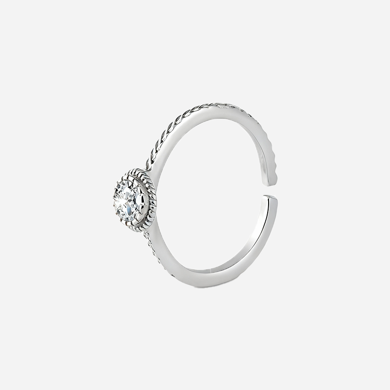 Ez az egyetlen fúrt textúrájú nyitott gyűrű egy lenyűgöző központi gyémánttal rendelkezik, amely az örökkévalóságot szimbolizálja, amelyet finom gyémánt díszítések vesznek körül egy csipetnyi luxusért. Egyedi dizájnja bármilyen öltözékhez illik, így minden alkalommal ragyogóan ragyoghatsz. Emeld stílusod magasabb szintre könnyedén ezzel a káprázatos, egyedi darabbal.