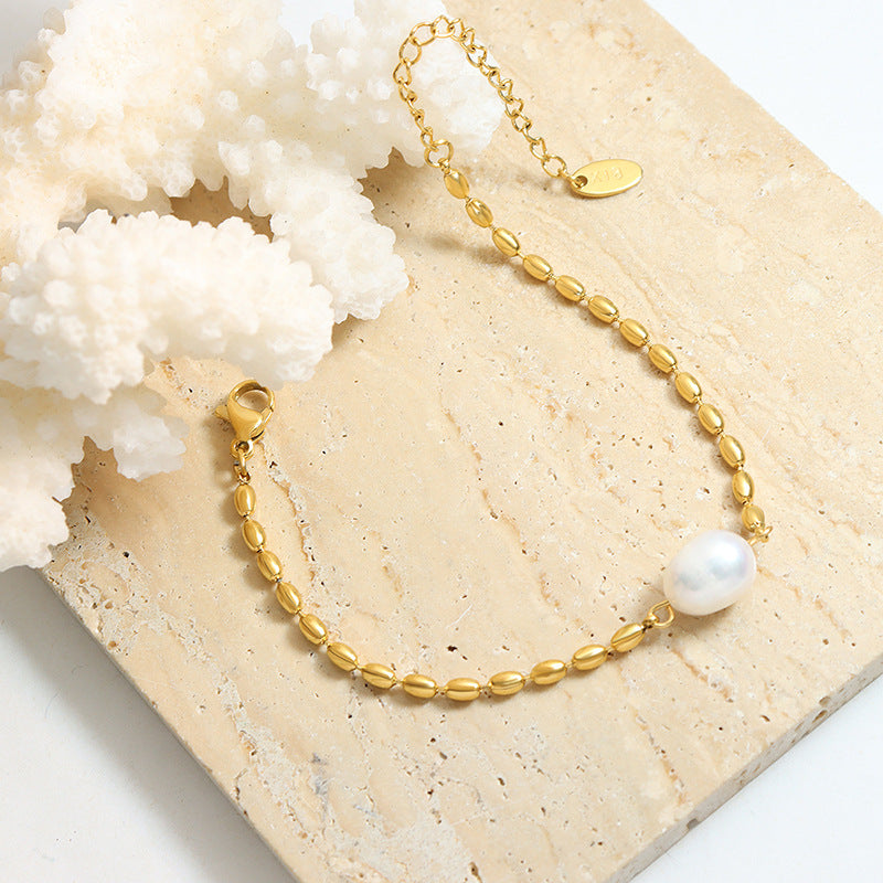 Lyft din handled med den diskreta lyxen i vårt elliptiska pärlarmband. Detta moderna klassiska smycke har en enda, glänsande naturlig sötvattenspärla centrerad på en unik kedja av polerade guldfärgade elliptiska pärlor. Tillverkat av förstklassigt titanstål med ett tjockt 18K guldbeläggning, erbjuder det en sofistikerad glans som är helt vattentålig, motståndskraftig mot missfärgning och skonsam mot känslig hud.
